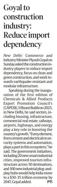 New Delhi: Commerce and Industry Minister Piyush Goyal on Sunday asked the construction in-dustry players to reduce import dependency, focus on clean and green construction, and work to-wards earthquake-resistant and modular infrastructure. Speaking during the inaugu-ration of the first edition of Chemicals & Allied Products Export Promotion Council’s (CAPEXIL) Vibrant Buildcon 2025, in New Delhi, he said sectors, in-cluding housing, infrastructure, commercial real estate, railways, airports, highways, and energy play a key role in boosting the country’s growth, “Every element, from cement and electricals to se-curity systems and automation, plays a part in this ecosystem,” he said. The government initiatives, including 20 new smart industrial cities, improved tourism infra-structure across 50 destinations, and 100 new industrial plug-and-play hubs would help India move to a $30-35 trillion economy by 2047, Goyal added.